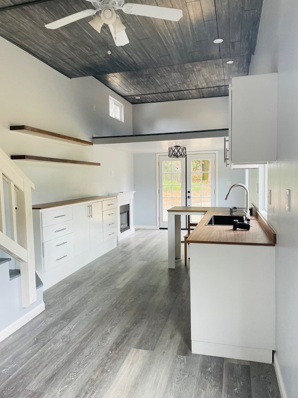 New (36’ x 10’) and lovely tiny house on wheels. The trailer has all new tires. The interior has one small bedroom, a bathroom with full size shower, a kitchen that can be fully equipped. (There are no appliances installed), good size living room, two lofts, one larger than the other and one with a staircase rather than a ladder, and ample storage.